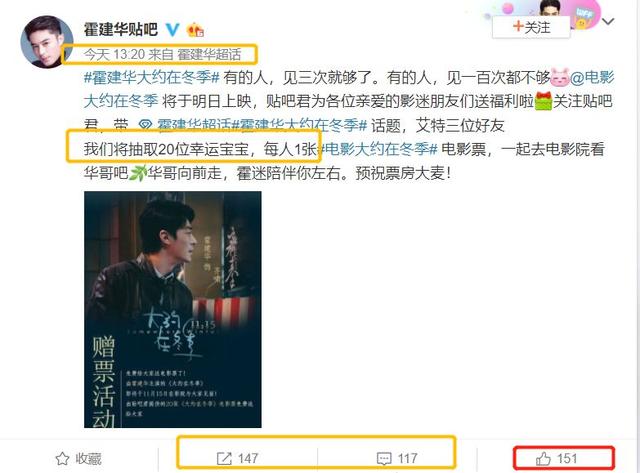 霍建华粉丝官方组织送票,下午一点多发送的微博,审核条件并不苛刻,转发人数不到200,还有重复转发,一号一次的点赞数只有151。