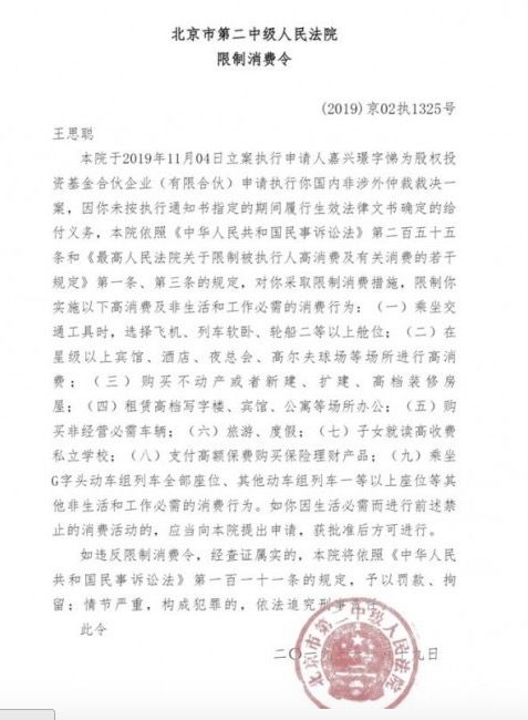 记者查询中国执行信息公开网发现,11月19日,王思聪被北京市第二中级人民法院发布限制消费令,因其未按执行通知书指定的期间履行生效法律文书确定的给付义务。此前,王思聪被上海市嘉定区人民法院下达限制消费令,后又取消。