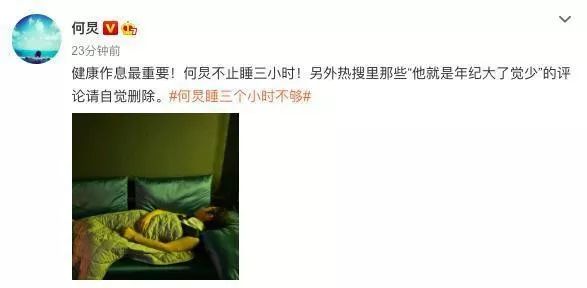 21日,何炅睡三个小时就够了引发热议,随后何炅晒出自己的睡觉照,回应称:“健康作息最重要!何炅不止睡三小时!另外热搜里那些'他就是年纪大了觉少'的评论请自觉删除。”还特意带上了话题“何炅睡三个小时不够”。