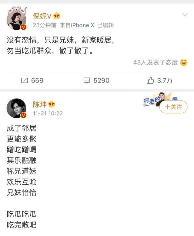 21日,有媒体爆料称倪妮深夜乘坐陈坤的座驾回到陈坤家中,疑似恋情曝光。刚刚,陈坤发文回应,称二人只是兄妹关系:“成了邻居,更能多聚,蹭吃蹭喝,其乐融融,称兄道妹,欢乐互呛,兄妹怡怡,吃瓜吃瓜,吃完散吧。”随后倪妮也否认称:“没有恋情,只是兄妹,新家暖居”。