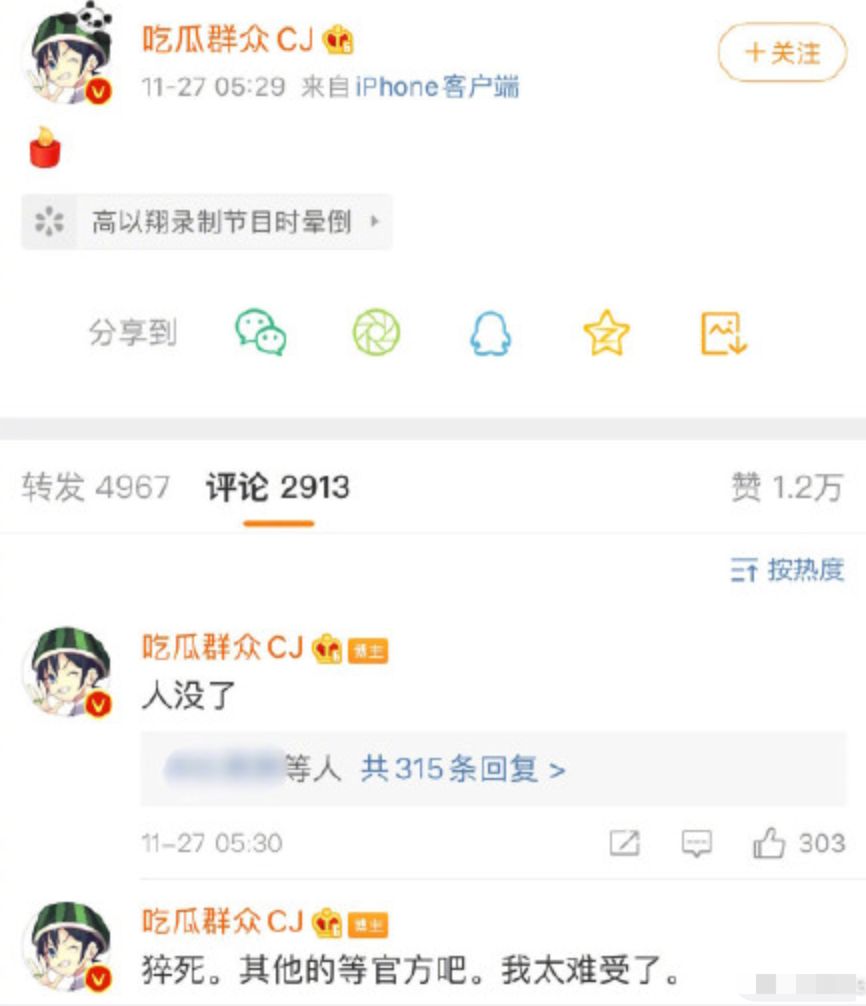 同时,紧接着又有媒体曝出,高以翔没了,不过这属于小道消息,不一定可靠。最终要以官方的通报为准。
