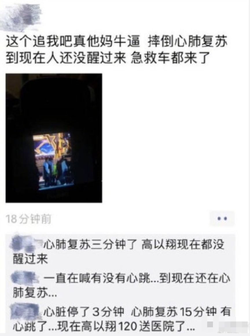 嘉宾高以翔被曝出在录制过程中,因为休克而昏迷,进行了三分钟的紧急按压之后,心跳仍然没有恢复。最后救护车抵达现场。