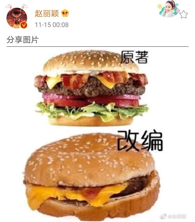 这让人不禁想起了此前颖宝晒出来的汉堡图,称原著饱满,改编后整部剧都成为了糟粕。