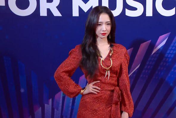 火箭少女101的孟美岐这次以solo歌手身份出席,一身暗纹收腰红裙,红唇配上金色环状项链和摇曳的耳坠,连鞋子都是红色的,整个人又飒又美,发丝随风飘扬撩动人心。