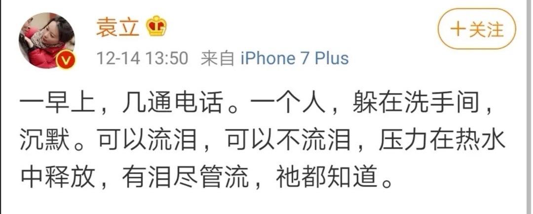 就在前两天,袁立在某社交媒体袁立发文表示自己躲在洗手间流泪,短小的断句以及一些感想用词乍一看上去,还被网友评价有点像“非主流体”。