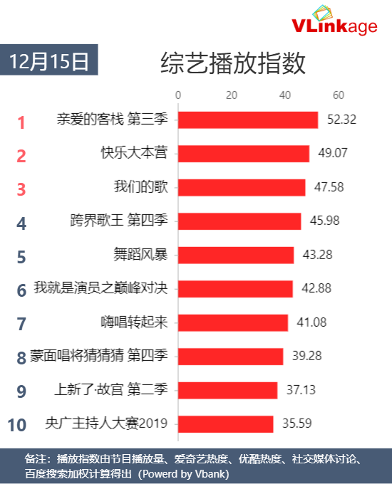 【综艺榜单】12月15日当日#综艺播放指数#:1.#亲爱的客栈 第三季#播放指数 52.32 2.#快乐大本营#3.#我们的歌#4.#跨界歌王 第四季#5.#舞蹈风暴#6.#我就是演员之巅峰对决#7.#嗨唱转起来#8.#蒙面唱将猜猜猜 第四季#9.#上新了·故宫 第二季#10.#央广主持人大赛2019#