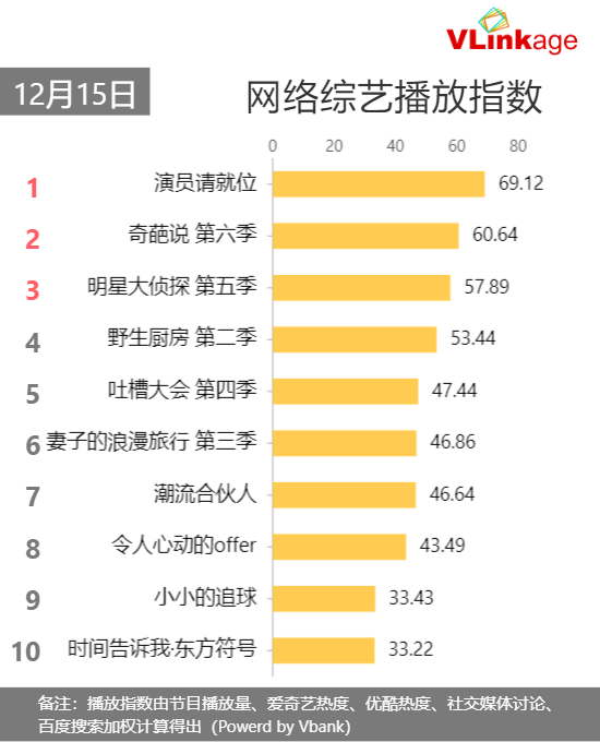 【网综榜单】12月15日当日#网络综艺播放指数#:1.#演员请就位#播放指数 69.12 2.#奇葩说 第六季#3.#明星大侦探 第五季#4.#野生厨房 第二季#5.#吐槽大会 第四季#6.#妻子的浪漫旅行 第三季#7.#潮流合伙人#8.#令人心动的offer#9.#小小的追球#10.#时间告诉我·东方符号#