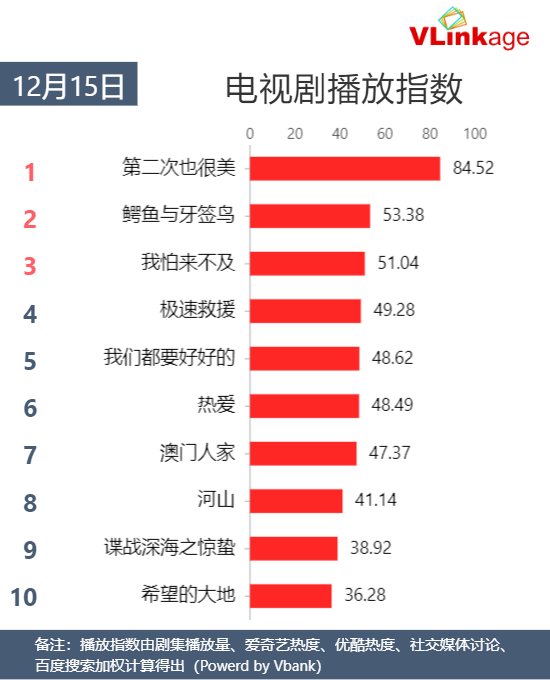 【纬岭榜单】12月15日当日#电视剧播放指数#:1.#第二次也很美#播放指数 84.52 2.#鳄鱼与牙签鸟#3.#我怕来不及#4.#极速救援#5.#我们都要好好的#6.#热爱#7.#澳门人家#8.#河山#9.#谍战深海之惊蛰#10.#希望的大地#