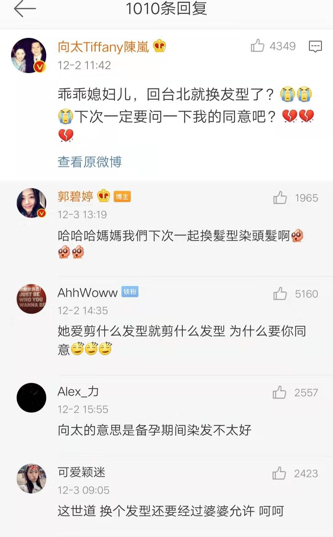 画风到了向太这边就不一样了,向太同样在评论区留言称:“乖乖媳妇儿,回台北就换发型了?下次一定要问下我的同意吧?”郭碧婷则回复:“哈哈哈妈妈我们下次一起换发型染头发啊”。