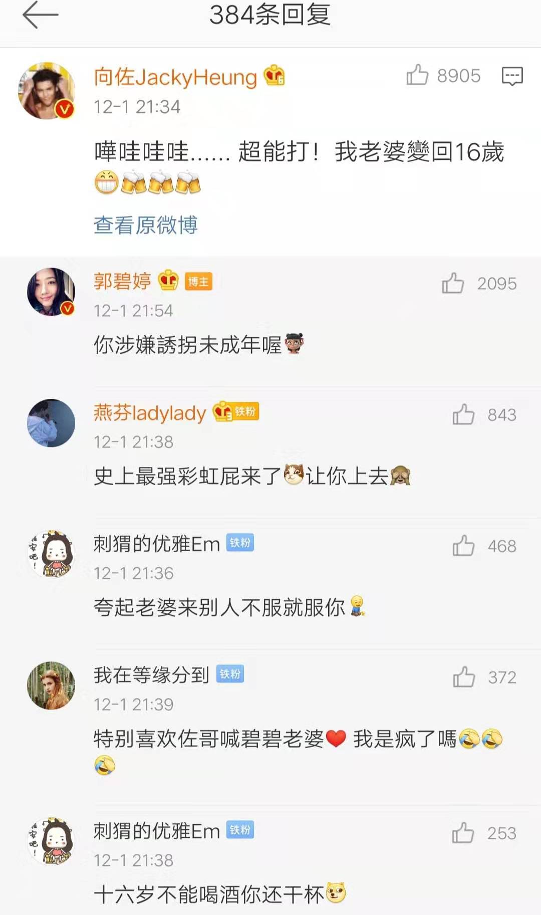 面对郭碧婷的染发,宠妻十足的向佐在评论区大放彩虹屁,赞老婆美回16岁,郭碧婷也俏皮的回复老公向佐:“你涉嫌诱拐未成年少女喔”,字里行间看得出来郭碧婷与向佐非常的恩爱幸福。