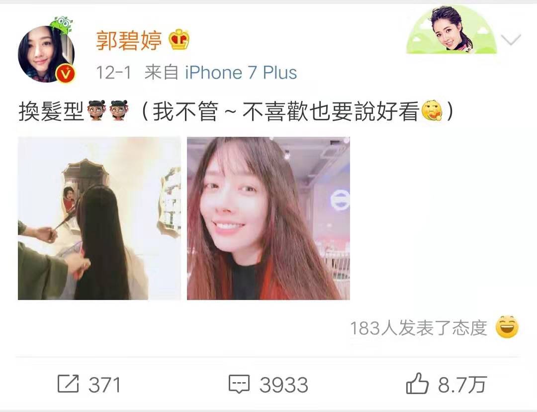 12月1日,郭碧婷在自媒体账号晒出两张照片表示自己换了新发型,还一脸傲娇的说,我不管~不喜欢也要说好看,照片中郭碧婷将留了多年的黑长直染成了棕色,内里还挑染了几搓红色,活似十年前的非主流少女,但郭美人却乐在其中。