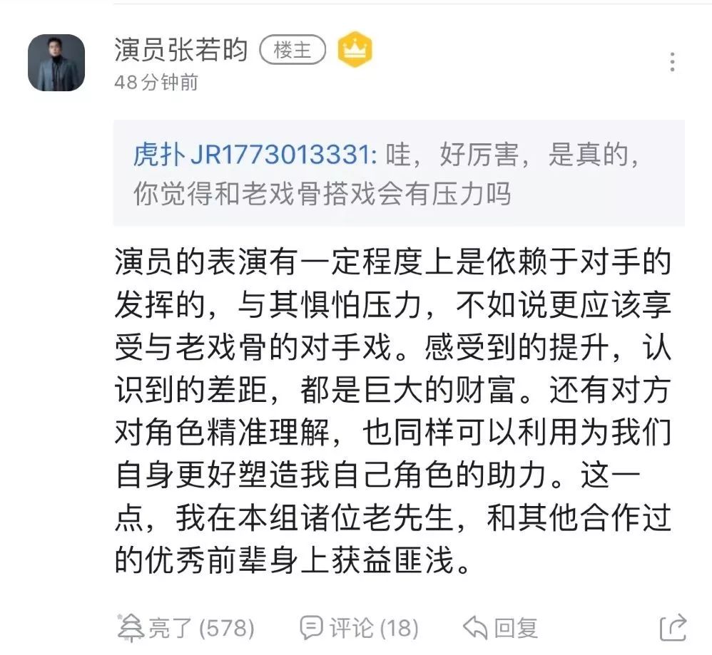 面对网友“和老戏骨搭戏会有压力吗”的提问,张若昀回答不卑不亢: