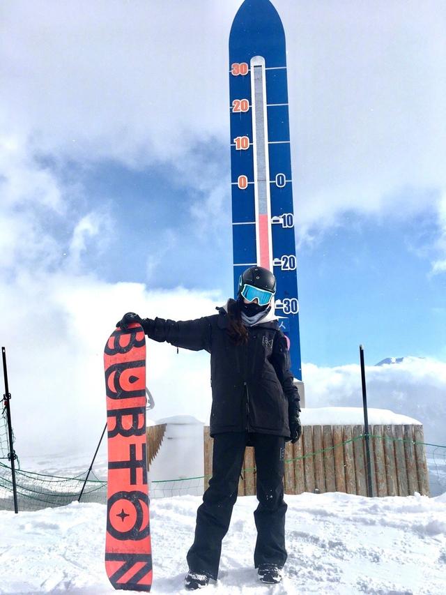 baby穿着一身厚厚的黑色滑雪服,手里拿着滑板,全副武装,配备是齐全了,摆拍姿势也很酷,就是不知道会不会滑,技术怎么样……