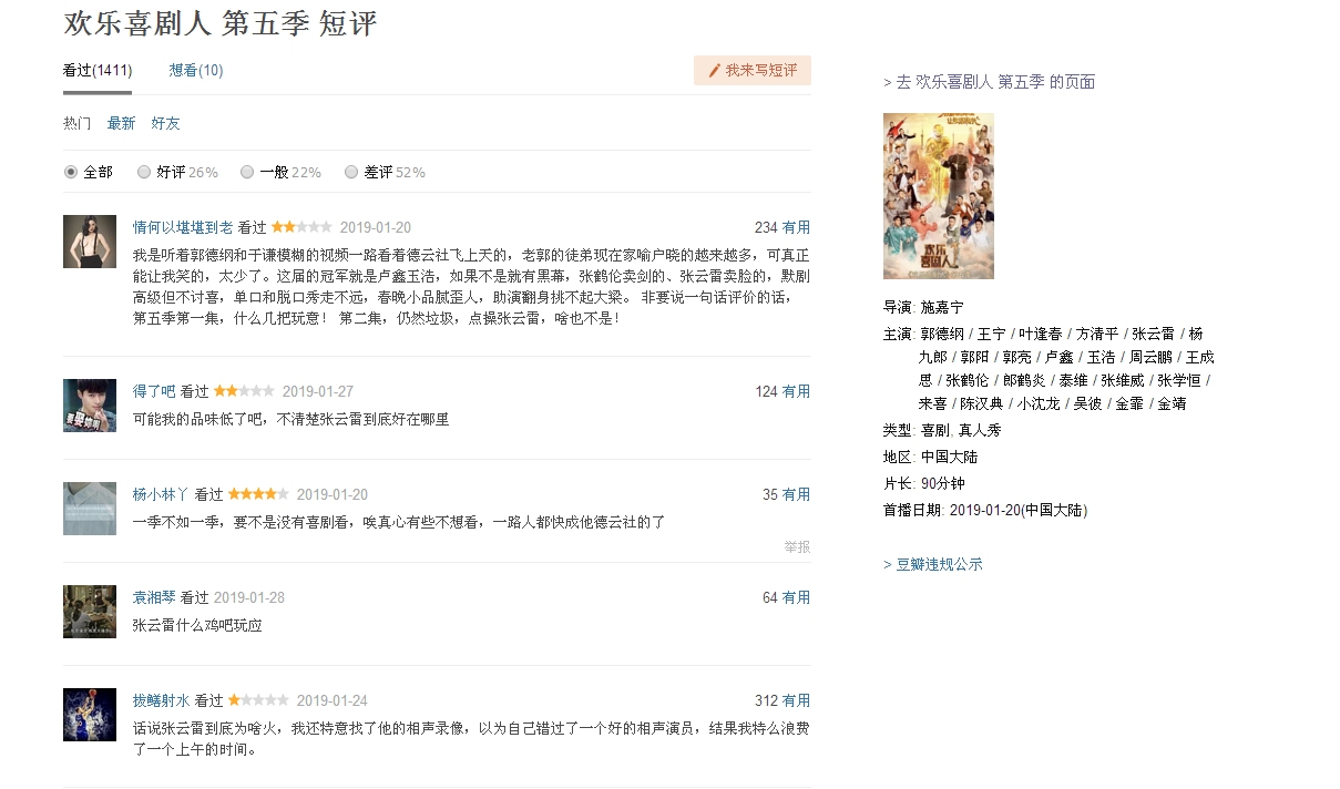 而《欢乐喜剧人》第六季的另一个“弊端”,可能是郭德纲的主持,及其德云社的参赛。第五季的喜剧人,因为德云社张云雷等人的参赛,被豆瓣网友吐槽无数。第五季,观众评分也跌落到不及格的5.2分。而第一季的喜剧人,曾获得8.2分的超好成绩。