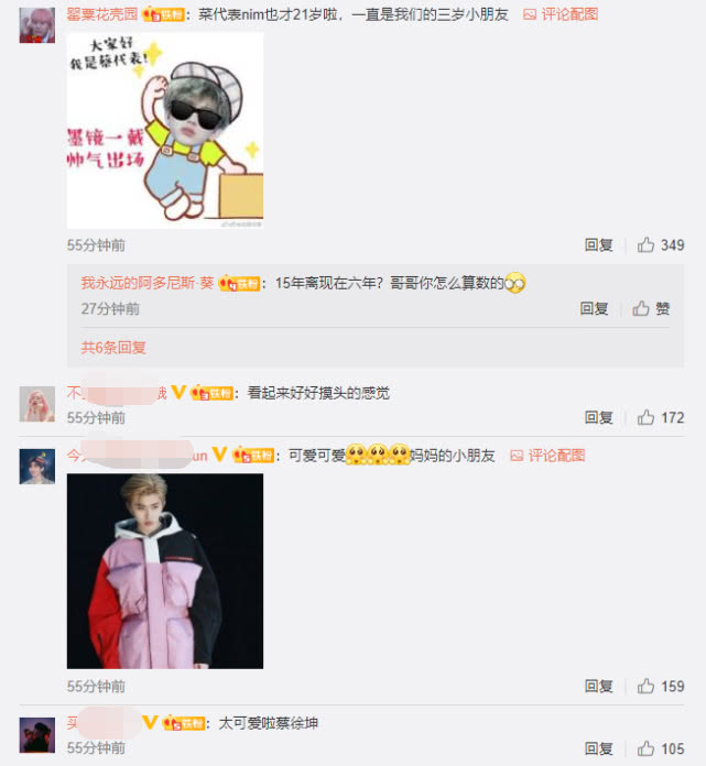 大家都知道蔡徐坤的粉丝很多,什么“女友粉”“妈粉”“阿姨粉”等等,万万没想到ELLA也是蔡徐坤的妈粉,EllA的性格不得不说真是很豪爽,本人不拘小节又超级有梗,而且又有实力,很多网友都很喜欢她。跟蔡徐坤这次同台互动,网友也都纷纷留言调侃:“菜代表nim也才21岁啦,一直是我们的三岁小朋友 。”很多粉丝直呼:“太可爱啦蔡徐坤”“可爱可爱,妈妈的小朋友。”