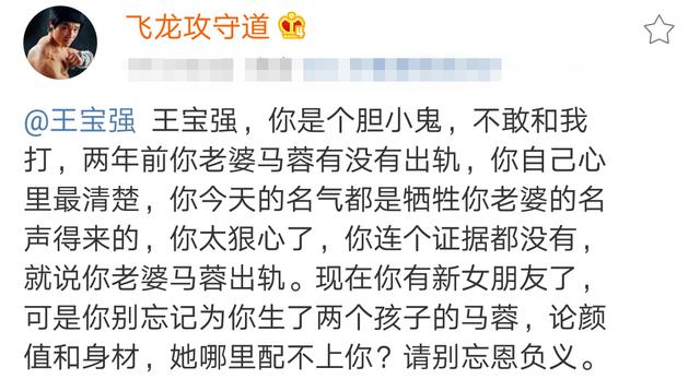 飞龙首先对影帝王宝强进行了隔空炮轰,他认为王宝强不该因为马蓉所谓的“出轨”而狠心和妻子离婚,并且飞龙觉得马蓉有没有出轨还值得商榷:“王宝强,你是个胆小鬼,不敢和我打,两年前你老婆马蓉有没有出轨,你自己心里最清楚,你今天的名气都是牺牲你老婆的名声得来的,你太狠心了,你连个证据都没有,就说你老婆马蓉出轨。现在你有新女朋友了,可是你别忘记为你生了两个孩子的马蓉,论颜值和身材,她哪里配不上你?请别忘恩负义。”