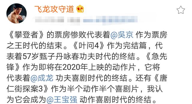 随即,飞龙又对王宝强、成龙、甄子丹、吴京等人的作品进行了点评,飞龙觉得他们最近一部电影都代表着各自时代的终结:“《攀登者》的票房惨败代表着吴京作为票房之王时代的结束。《叶问4》作为完结篇,代表着57岁甄子丹咏春功夫时代的终结。《急先锋》作为即将在2020年上映的动作片,它将代表着成龙功夫喜剧时代的终结。还有《唐仁街探案3》作为半个动作半个喜剧片,我认为它会成为王宝强动作喜剧时代的终结。”