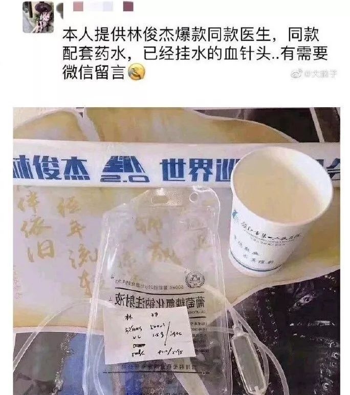 昨天林俊杰演唱会结束之后因为感冒了就去医院打吊针,发朋友圈的这个人也不知道是医院工作人员还是什么的,就在朋友圈出售“林俊杰用过的吊针”。