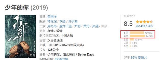 《少年的你》上映3天,票房已经达到了5.74亿,豆瓣评分高达8.5分,超过25万网友打了分数,四星以上好评率高达86.7%。观众的好评来源于导演的用心良苦和出色的编剧,当然更是对易烊千玺、周冬雨的高度认可。周冬雨一直以演技派著称,表现一直很好。而易烊千玺则让观众喜出望外,没想到这样一个乖乖男,竟然已经蜕变成卓越的实力派。