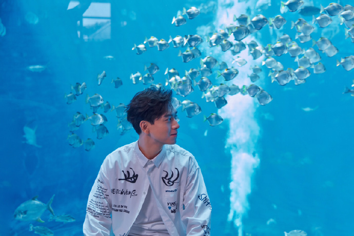 李现坐在成群的鱼群前面,看着鱼群游过来的方向,留给镜头一个嘴角上扬的侧脸,此刻多希望站在现男友的身边呀!看来要继续坚持打卡哦!这样就会有更多福利啦!