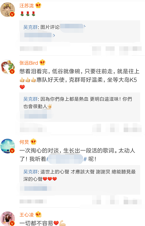 当吴克群将这段视频发出之后,得到众多明星的响应,何炅、汪苏泷、王心凌、张韶涵、谭维维等人都感慨发言。可见大家被惠若琪的精神所打动,也看到了聚光灯下的自己,同时也是对惠若琪与吴克群两人的认可。