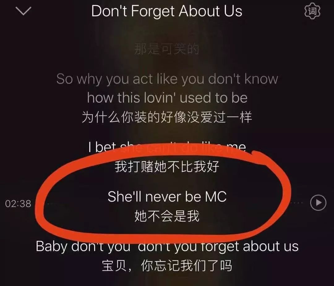 于是乎当时就有很多粉丝用着《Don't Forget About Us》的歌词“She will never be MC”去抨击Miley Cyrus。