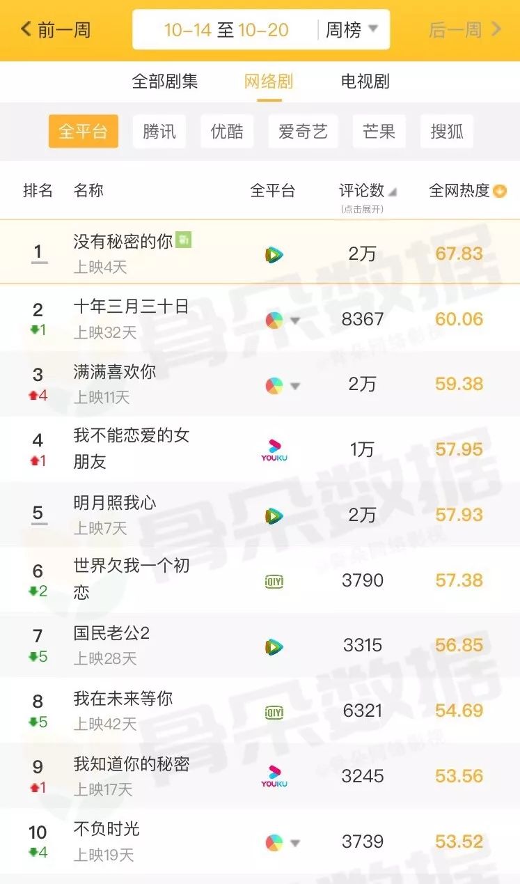 从热度和评论量维度观察,腾讯视频新上线的都市情感剧《没有秘密的你》最受欢迎,仅上线4天就已获得超两万评论数,并在综合热度中排名第一,成功超越再前一周的霸主《十年三月三十日》。此外,《满满喜欢你》《明月照我心》《我不能恋爱的女朋友》等剧集评论数也比较高。