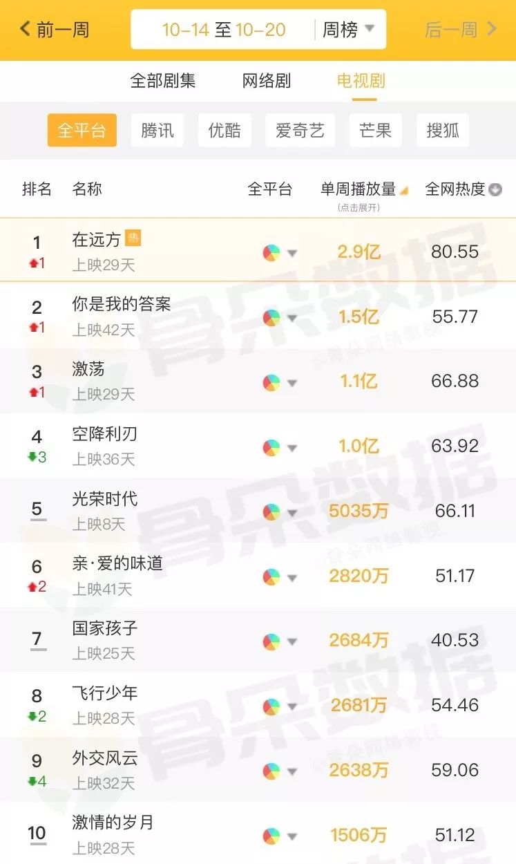 网播方面,《在远方》以2.9亿周播量排名第一,且该剧在全网热度也比较高。周播剧《你是我的答案》和《激荡》周播量破亿,排名分别提升一个顺位。但同时可以看到,从《光荣时代》开始,电视剧网播量出现明显断档,体量在千万量级的电视剧取得较高播放量者寥寥。
