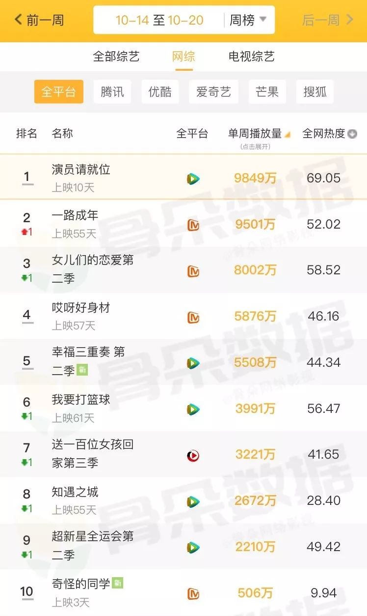 而目前热度较高的《演员请就位》播出第二期,全网热度同样较高,上周周播量9849万,成为眼下破亿网综的种子选手。腾讯视频另一档节目《超新星全运会2》上周评论量和热度略有下滑。