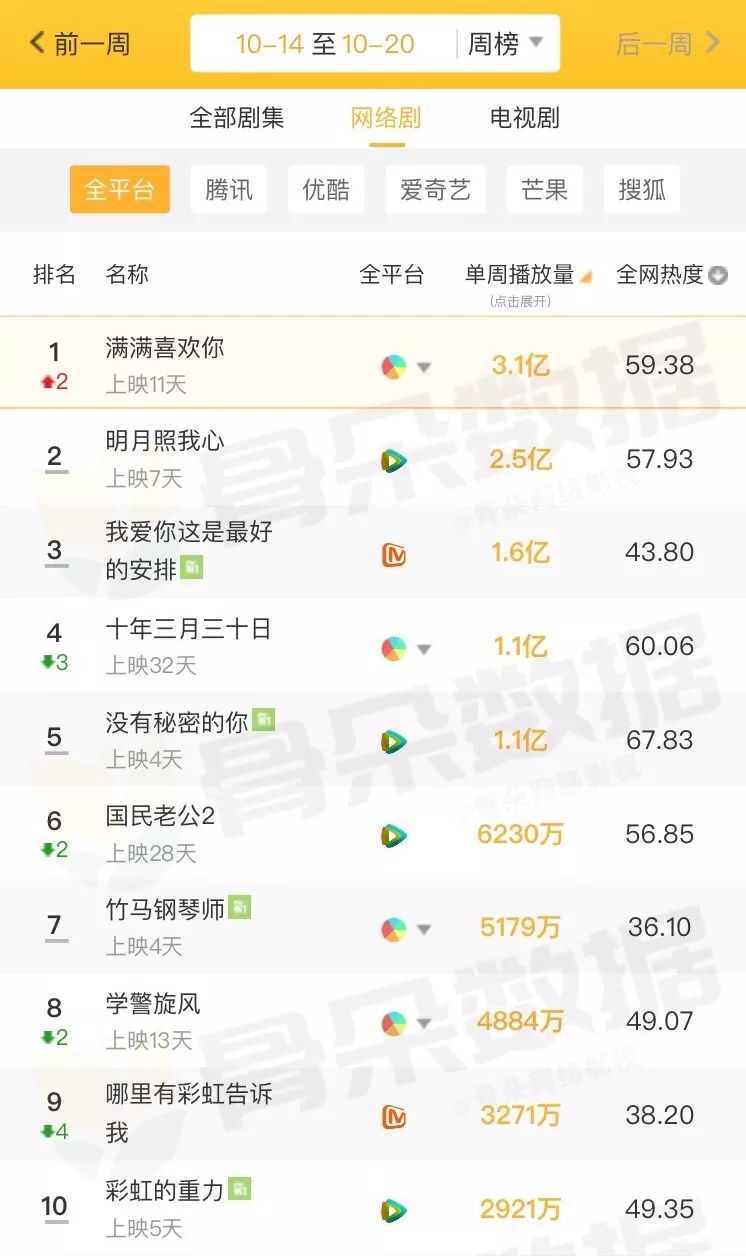 而从播放量维度观察,《满满喜欢你》则以3.1亿次周播量夺魁。《明月照我心》播放量在2亿量级,另有三部剧集周播量破亿。而上周上线的新剧中,《我爱你这是最好的安排》《没有秘密的你》两部网剧播放量破亿,《竹马钢琴师》和《彩虹的重力》播放量在千万量级。