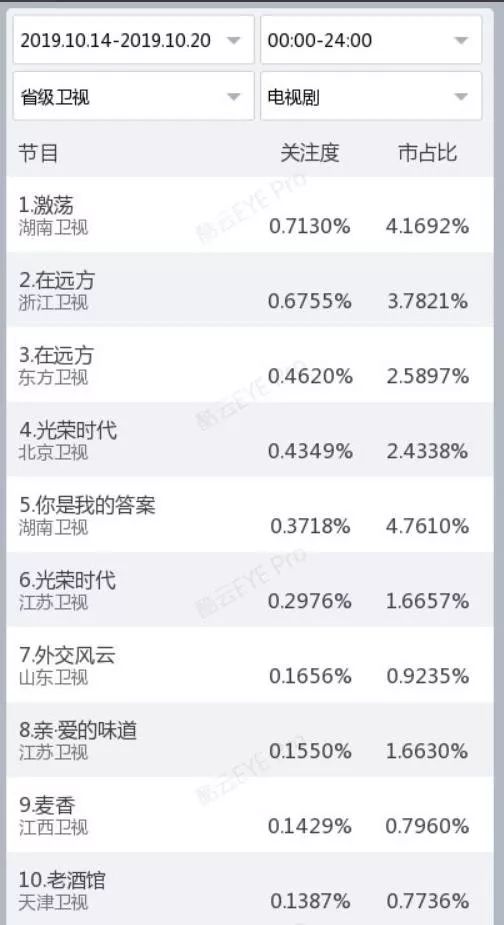 酷云直播关注度系统中,《激荡》的直播关注度更高,平均下来排在上周第一位,浙沪拍档联播的《在远方》次之,《光荣时代》的直播关注度略显低迷。