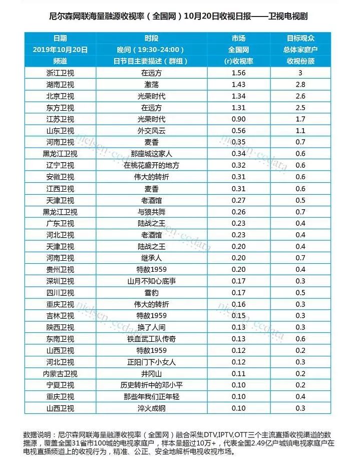 此外,在尼尔森网联海量融源收视率的测量榜单中,《在远方》《激荡》《光荣时代》三档节目收视率不相上下,绝对值均比较高。