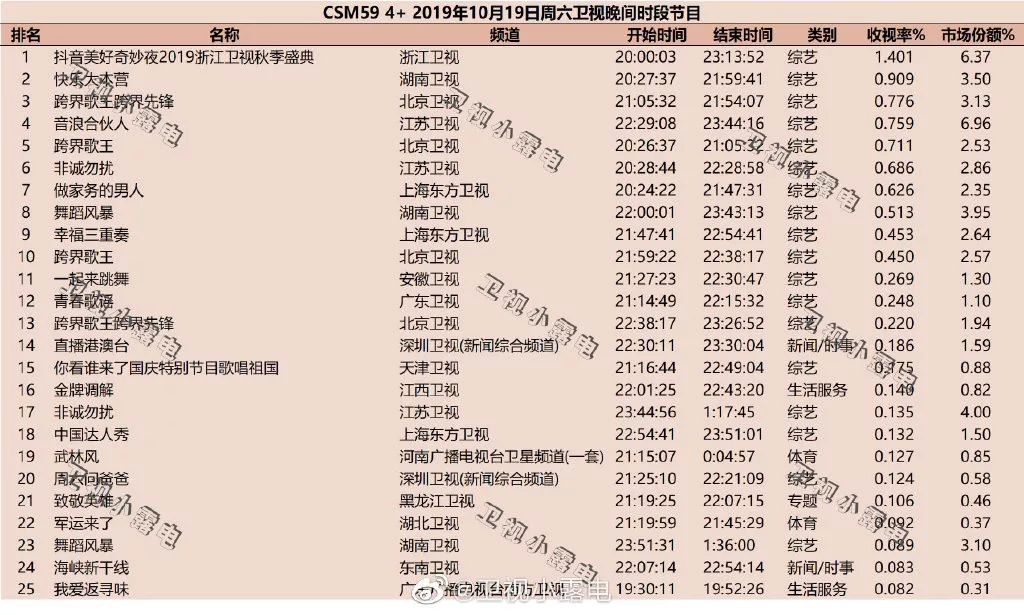 周六,浙江卫视直播《抖音美好奇妙夜》,与短视频的联动、强大明星资源,成就1.4的59城收视。《快乐大本营》《音浪合伙人》发挥稳定,保持在自身平均水平线附近。《跨界歌王》播出第二期,收视率比首期节目有小幅提升。而《非诚勿扰》的收视率稍低于其以往水平。