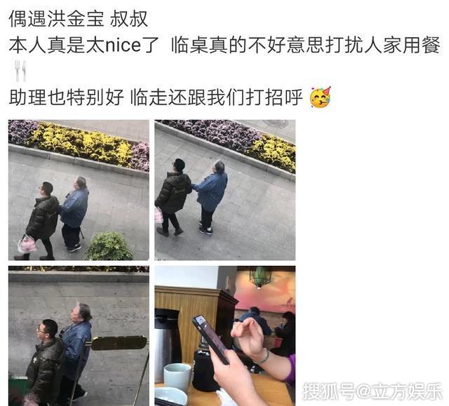 从画面中可知,当日该网友就座在洪金宝的身后就餐,但考虑到打搅私人行程多有不敬,因此该网友只是偷偷拍了一张留念。看得出来,洪金宝大哥和助理边吃边聊,心情相当不错。右手边同时还有一位女士作陪,可见洪金宝大哥虽廉颇老矣,但魅力依旧不减。