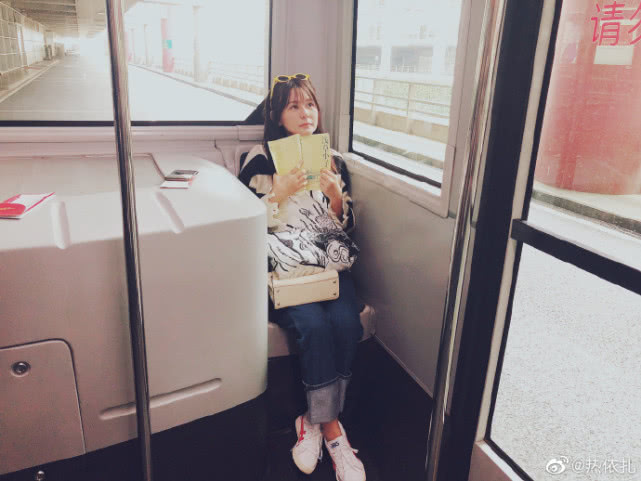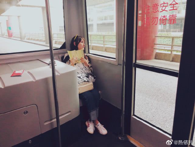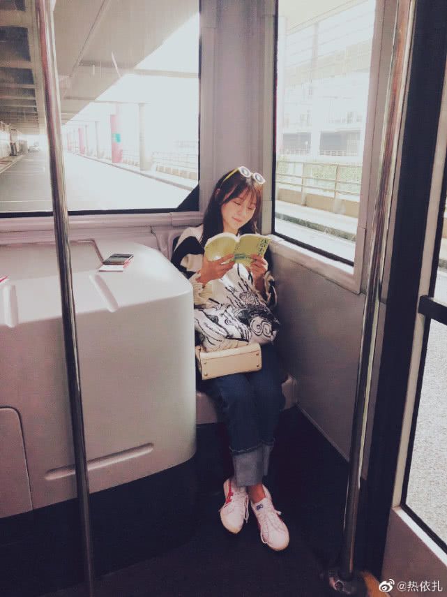 由于使用了滤镜,使得照片看起来灰蒙蒙的,热依扎穿着黑白宽条纹针织衫,手中拿着一本书,一会儿认真看书,一会儿望着远处像是思考着什么。