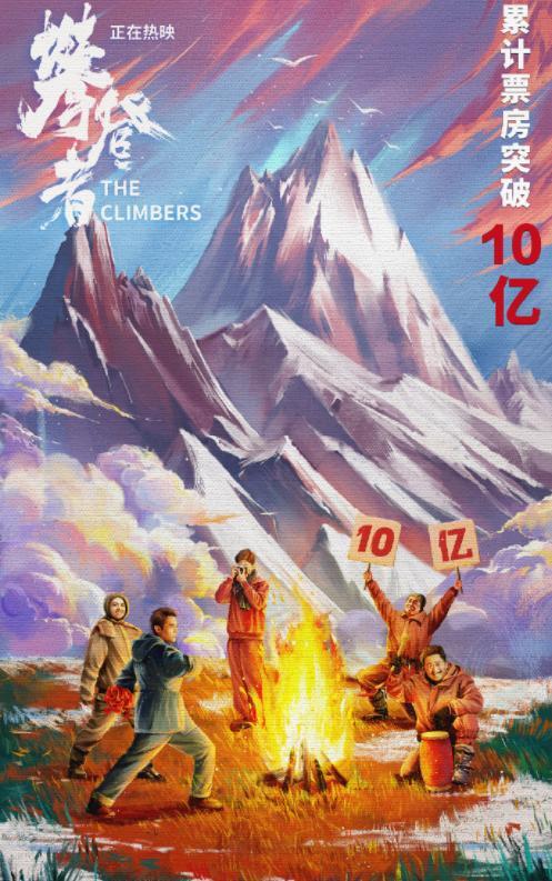 电影攀登者官方微博也发布了庆祝票房破10亿的海报。吴京、井柏然五个人围着篝火,势头正猛,背后正是喜马拉雅山。整个海报画面非常壮观,五个人的表情各异,但是都精神抖擞,向他们的目标进发,脸上洋溢着幸福的笑容。