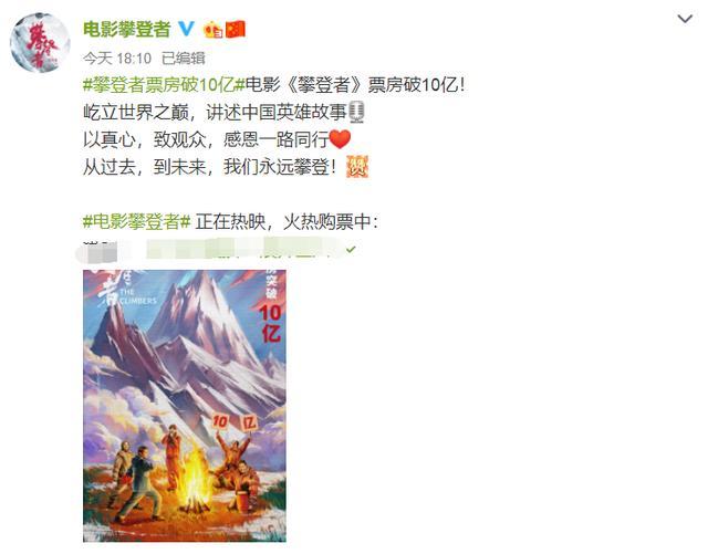 由吴京主演的电影《攀登者》票房正式破10亿。祝贺《攀登者》,祝贺吴京!