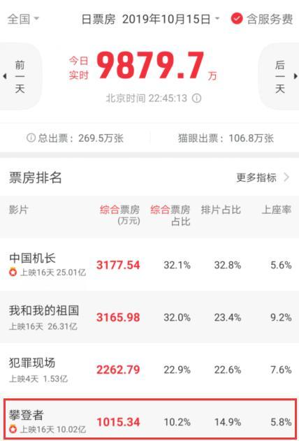 从单日票房来看你,《中国机长》继续票房榜首。总票房也达到25亿多,和《我和我的祖国》票房非常接近。而《攀登者》上映16天后,单日票房仍然有1015万,可谓口碑发酵,支持的观众越来越多,后续还有望继续攀升。