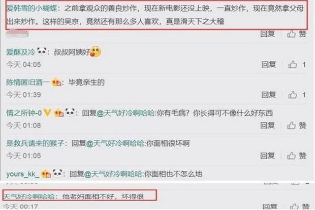 有网友直接在吴京和父母吃饭的微博下留言:之前拿观众的善良炒作,现在电影还没上映,一直炒作,现在竟然拿父母出来炒作。这样的吴京,竟然还有那么多人喜欢,真是滑天下之大稽。除此之外,在豆瓣上,关于《攀登者》出现了数千条一星差评,很多人直接把矛头对准吴京。