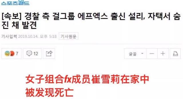 10月14日,25岁韩国艺人崔雪莉被证实死亡的消息令外界震惊。据悉,韩国警方已经确认了雪莉死亡申报,随后确认前f成员、艺人崔雪莉是自杀。其经纪人到达雪莉家中时,雪莉已经在2楼房间的照明灯上吊自杀。随后,经纪人才报警。