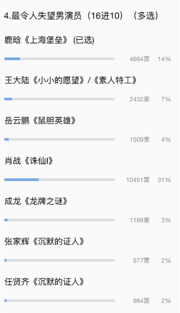 而“最令人失望男演员”中,肖战甚至占到了31%的投票数,这个数据还是挺令人意外的。