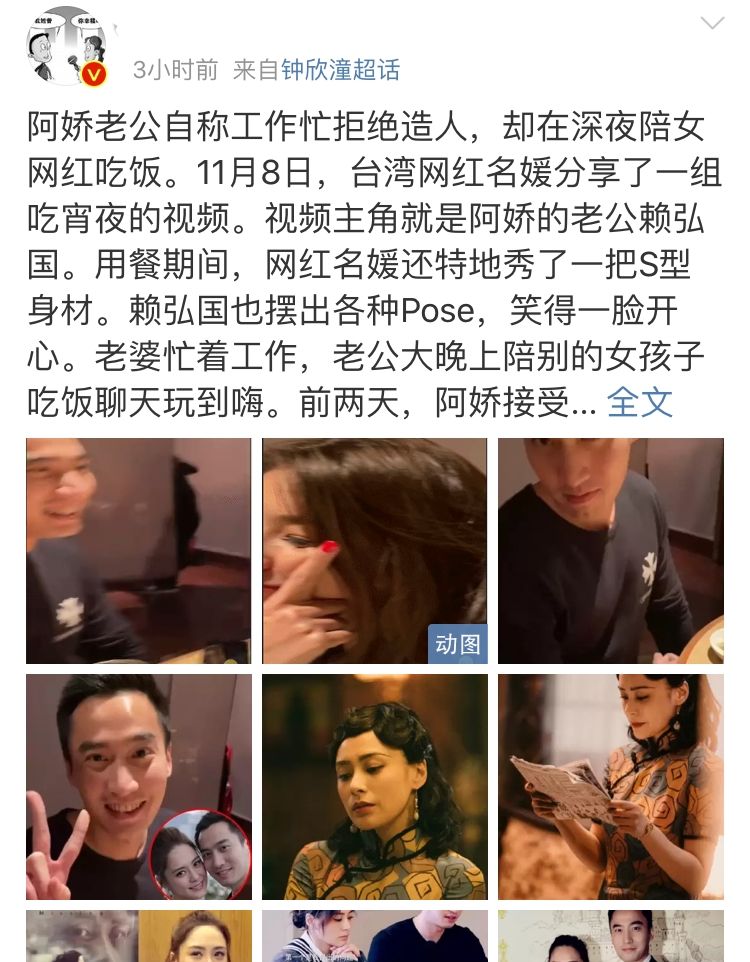 这一边的阿娇卖力挽回夫妻形象,可另一边的赖弘国却似乎不太给力。今年9月,赖弘国又被曝关注点赞女网红,该网友还表示手里还有赖弘国出轨的证据,该爆料者还发出了所谓赖弘国与别人视频的截图。