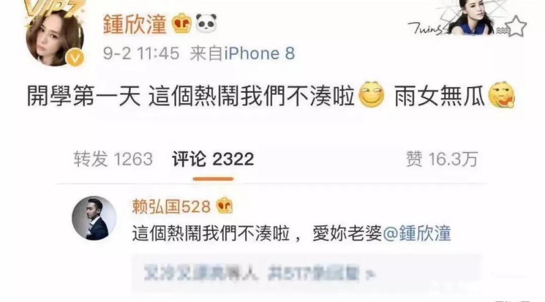 事后阿娇为力证夫妻感情不错,她亲自回应“开学第一天,这个热闹我们不凑啦,雨女无瓜”,赖弘国也转发称“这个热闹我们不凑啦,爱你老婆”表示立场。