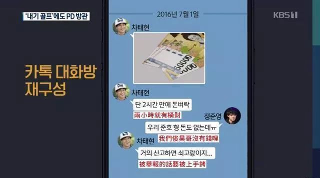 “郑俊英事件”爆发后,“黄金手机”内的聊天记录扯出无数后续风波。其中《两天一夜》聊天室内车太铉与金俊浩于2016年7月的一段对话,正是所谓车太铉非法赌博案被发现的导火索。