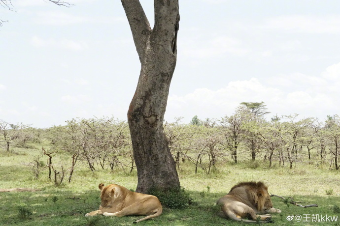 这张图两头狮子趴在地上休息的照片,可以说王凯捕捉得很好了。