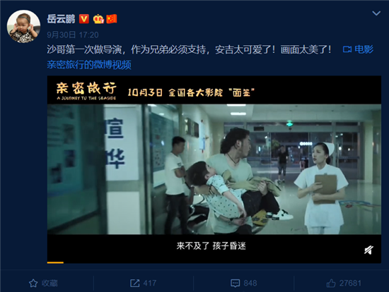 沙溢处女导电影,会在这个国庆档三号上映,娱乐圈的不少同行都在为沙溢当宣传员。很喜欢给同行当宣传员的岳云鹏自然也不会缺席,于是30号在网上发文:沙哥第一次做导演,作为兄弟必须支持,安吉太可爱了!画面太美了!沙溢也亲自下场感感谢:谢谢我家小岳。就回了六个字,粉丝们却不乐意了,直接就喊话:小岳是我们的,不是你家的!别跟我们抢岳岳,岳岳是大家的!看粉丝们调侃就能感受到岳云鹏受粉丝们喜爱的程度,不过调侃归调侃,岳云鹏宣传沙溢的新电影,不少粉丝也实力支持,有粉丝就说已经安排上了。