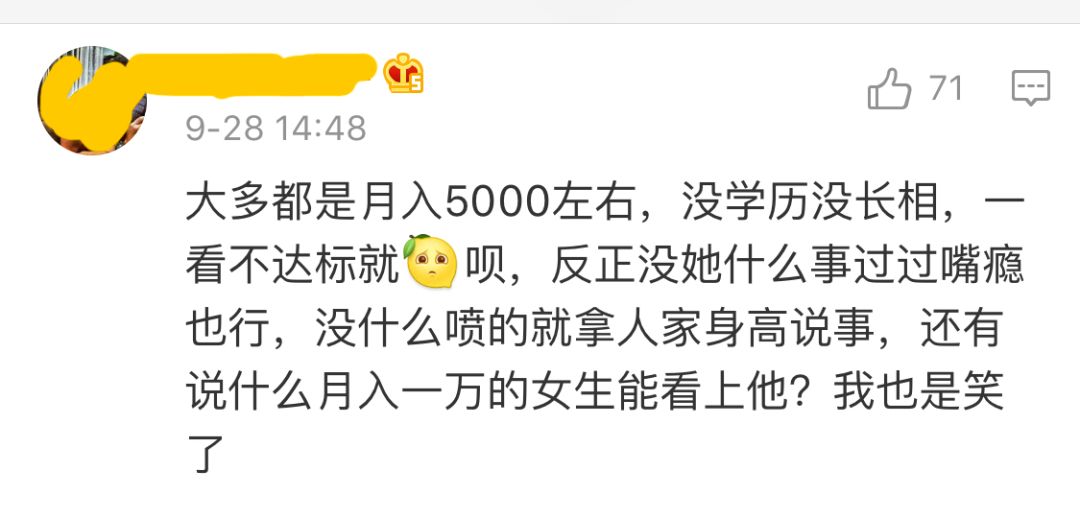 你瞧,男人们的逻辑依然是简单直接粗暴的——瞧不上170万年薪的男人,你是不是觉得自己的条件能配得上年薪1700万的男人啊?