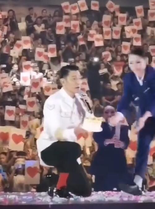 原标题:刘德华演唱会上感动落泪,双膝跪地接粉丝礼物太