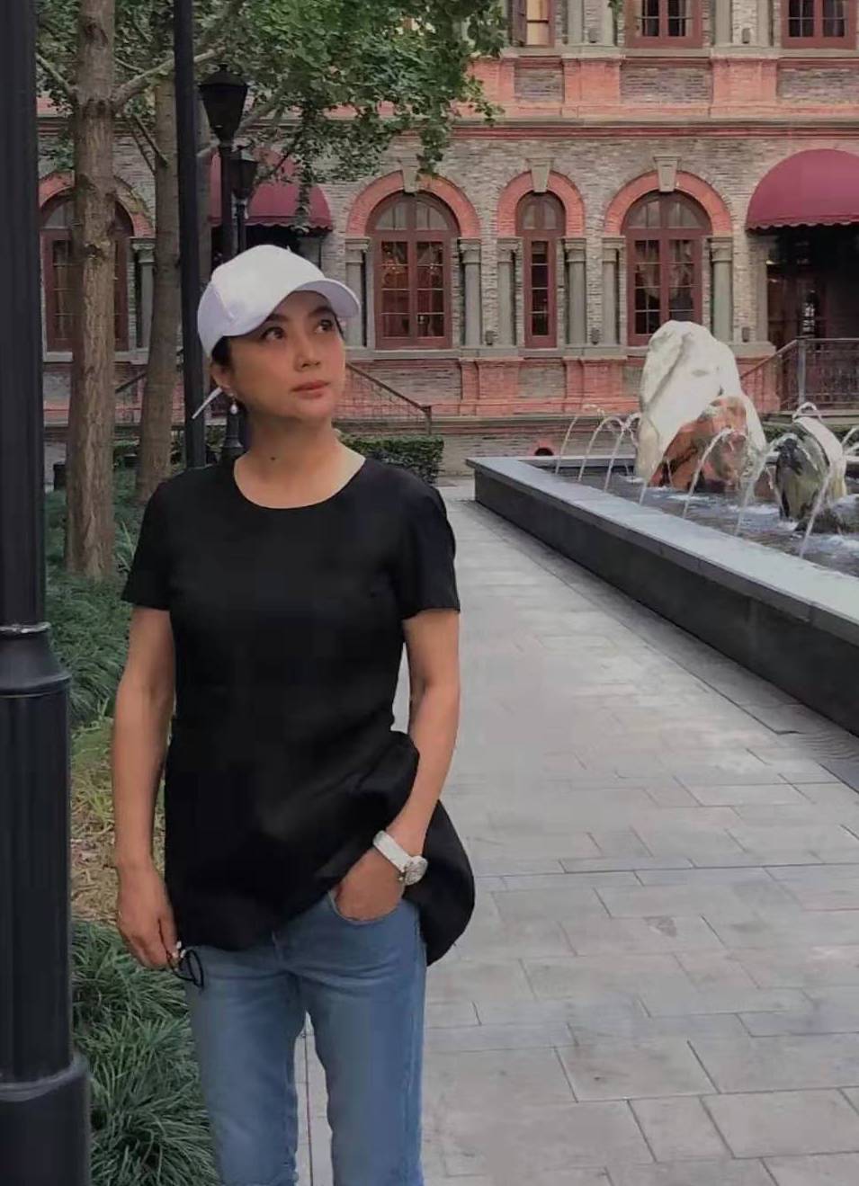 从照片中可以看出李玲玉白帽黑衣,穿着紧身牛仔裤身材匀称,四肢纤细,虽然打扮简单但丝毫不减当年的风采。