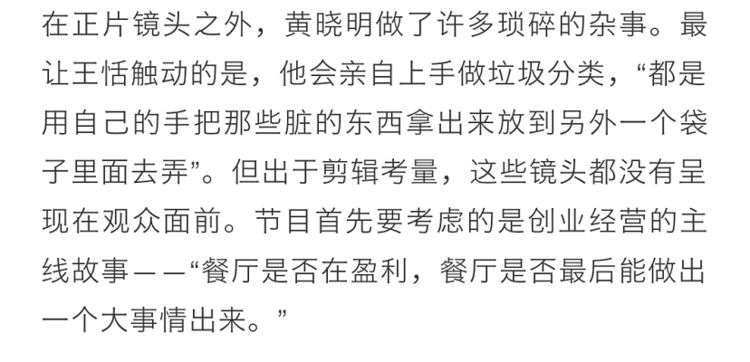 其实类似的话,此前节目组在采访时也说过。黄晓明对待节目态度很认真,带着店员们,在零启动资金的情况下,完成了《中餐厅》2万营业额的目标。此外,黄晓明即使在镜头外,也在认真为中餐厅做事,“把脏东西放到另一个袋子里”,如果只是抱着玩玩捞钱的态度,是做不到如此的。